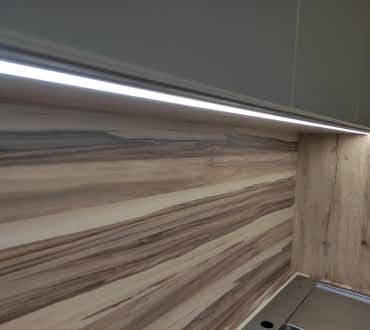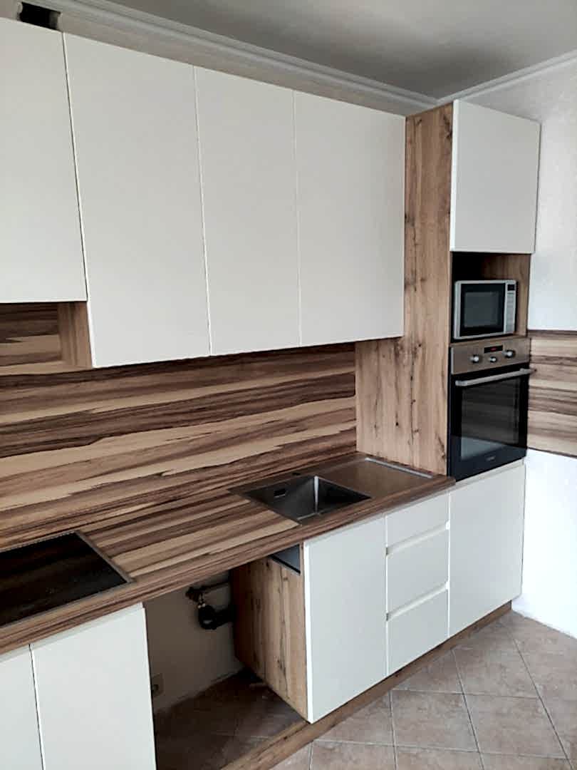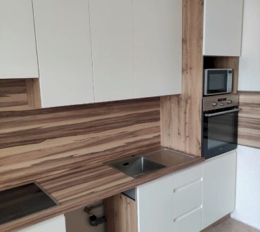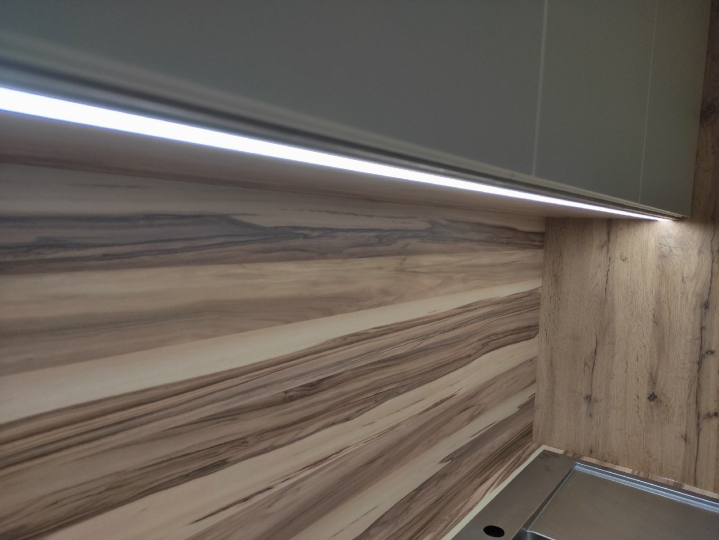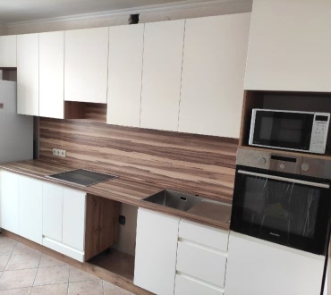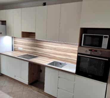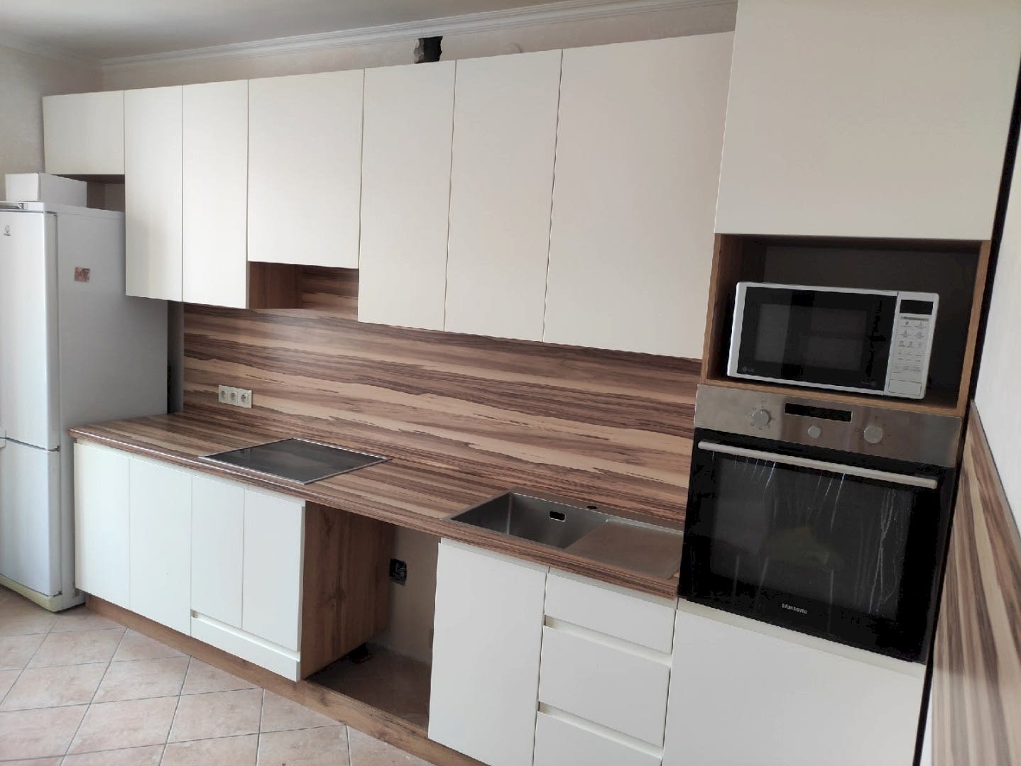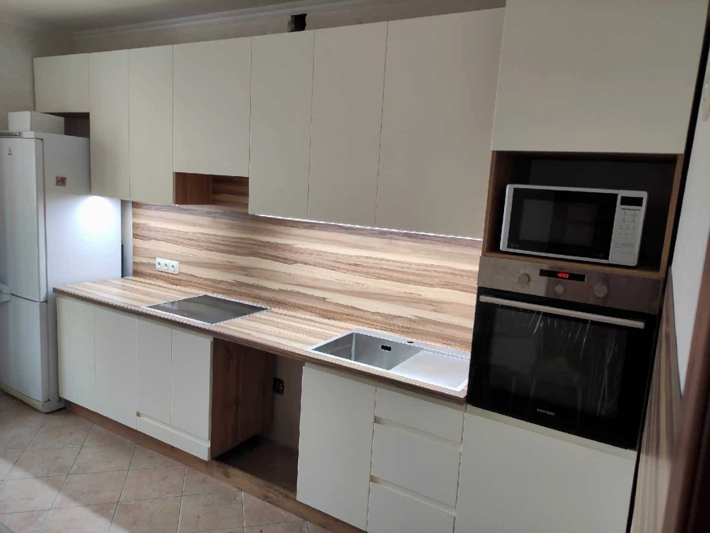 Кухня на заказ. Материал корпуса ЛДСП в кромке ПВХ. Влагозащищенная столешница. Фасады мдф крашенные, матовые с Pin-Up ручками. Петли с доводчиками, направляющие скрытого монтажа Blum. Led подсветка.