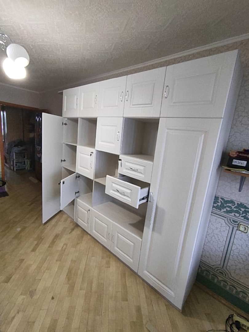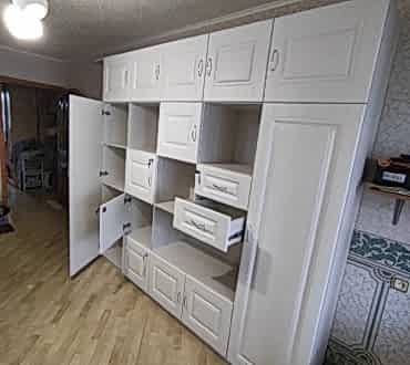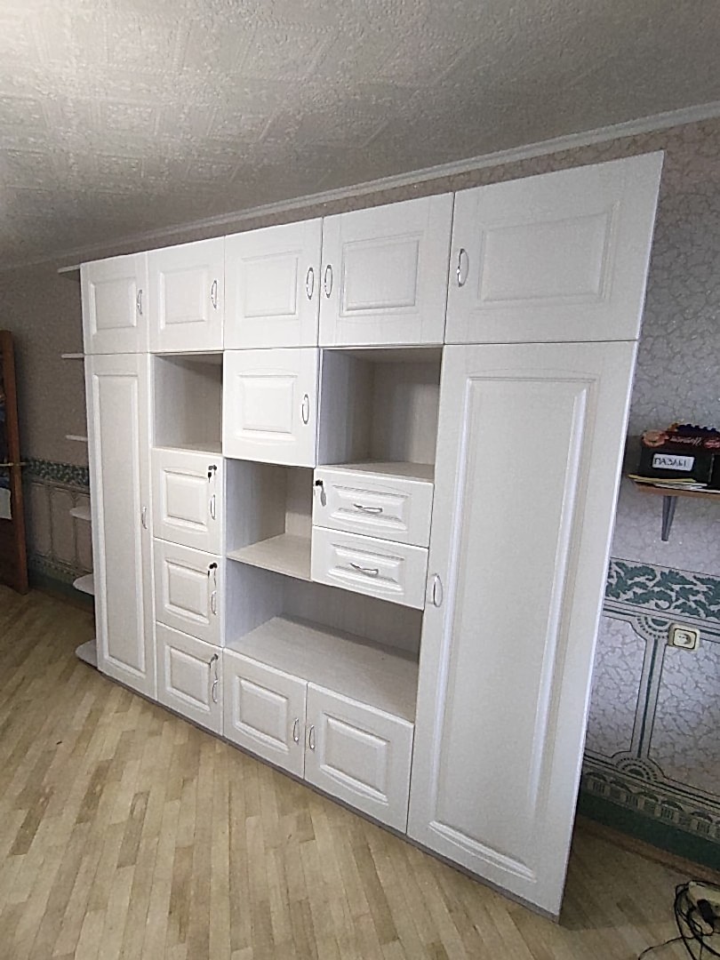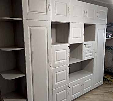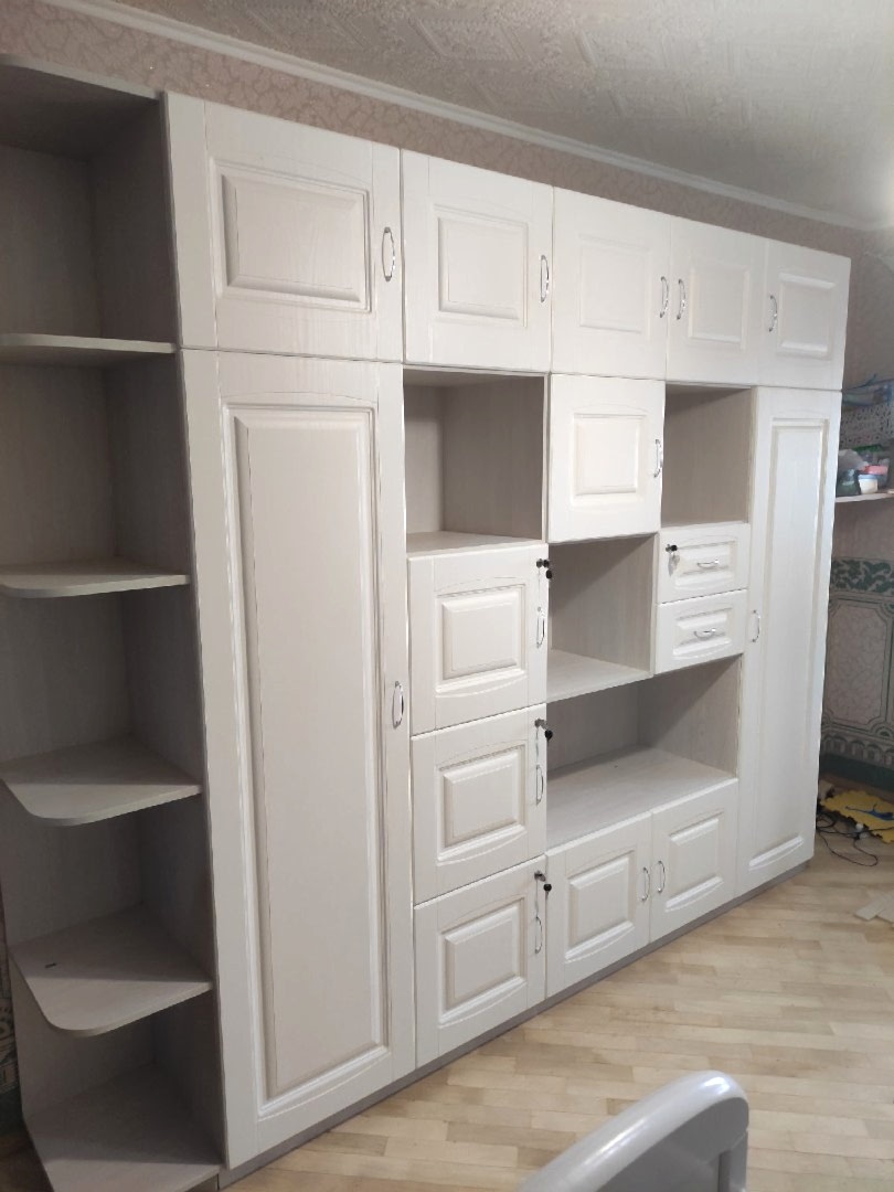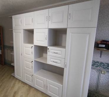 Стенка в гостиную. Корпус из ЛДСП, фасадная часть из МДФ в плёнке пвх с фрезеровкой. Цвет корпуса - ясень анкор. Фасады - белый ясень. Стенка была установлена в Нижнем Новг. ороде на, ул. Рыскулова, 81.