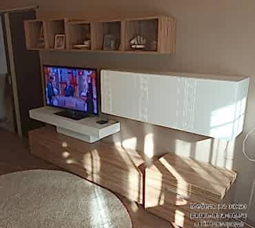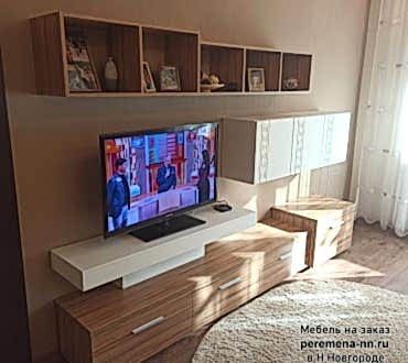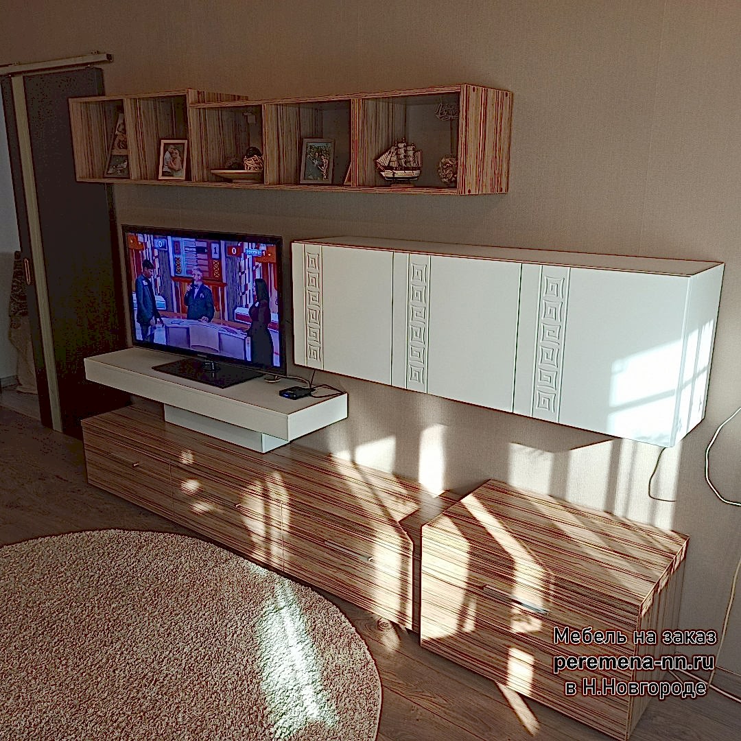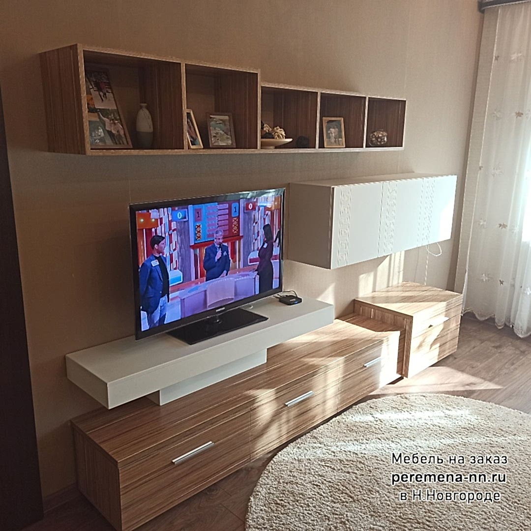 Стенка для гостиной. Корпус лдсп эбони светлый. Фасады и подиум из мдф в плёнке пвх белого цвета. У белых ящиков стоит система открывания дверей без ручек.. Ящики с доводчиками. Сделаем любую стенку, горку под ваши размеры!!!