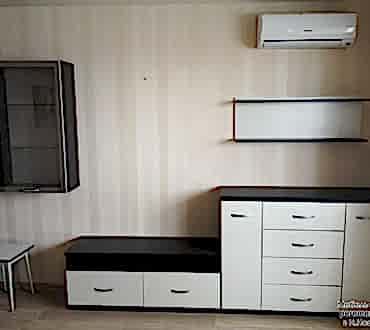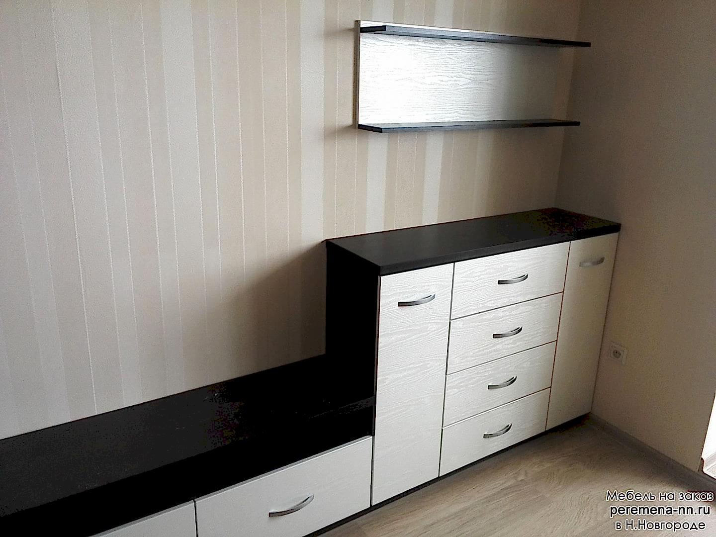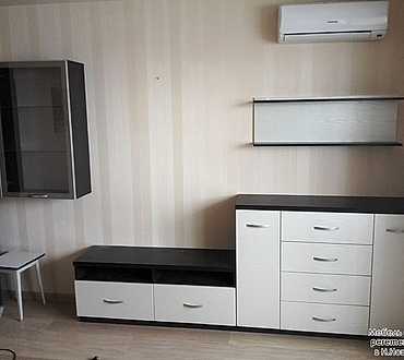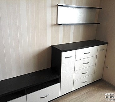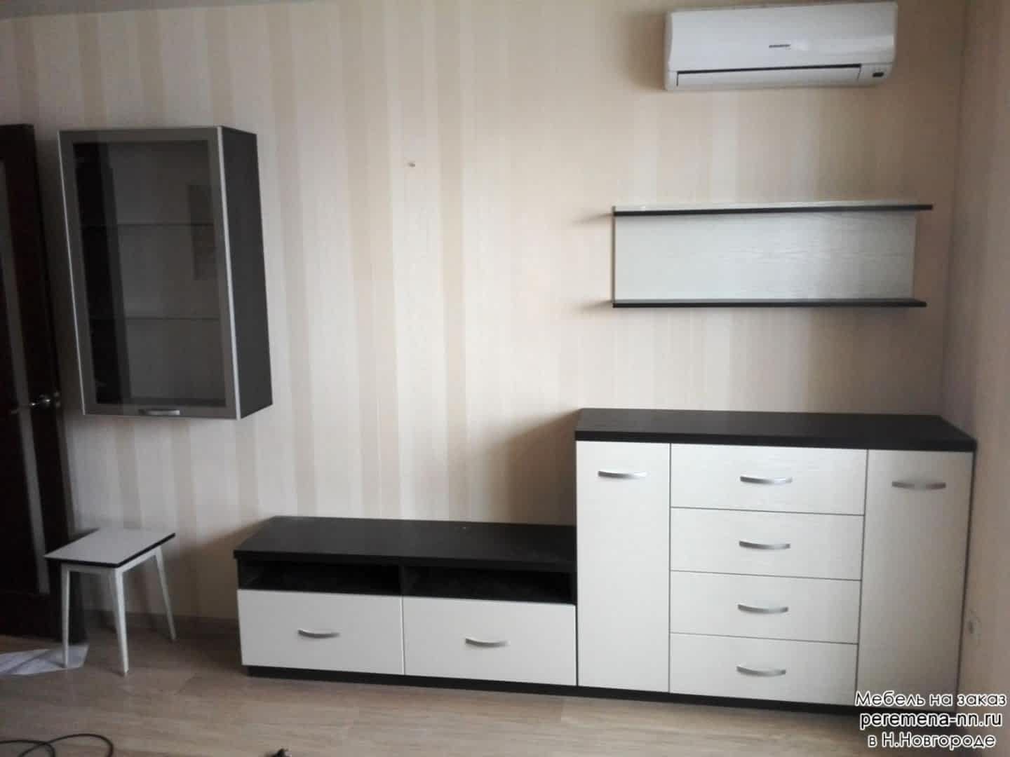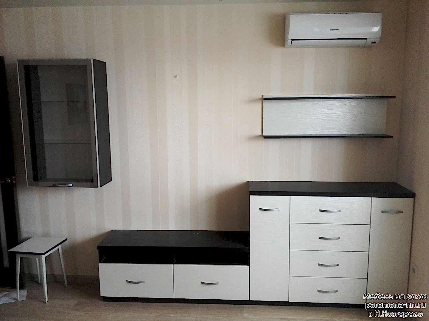 Мебель для гостиной, изготовлено по индивидуальным размерам. Корпус ЛДСП цвет (венге), фасады МДФ в ПВХ плёнке цвет (перламутр) у подвесного шкафа фасад в алюминиевом профиле с тонированным стеклом.
