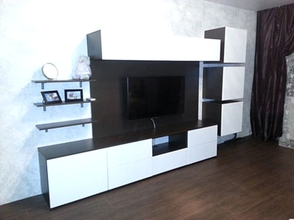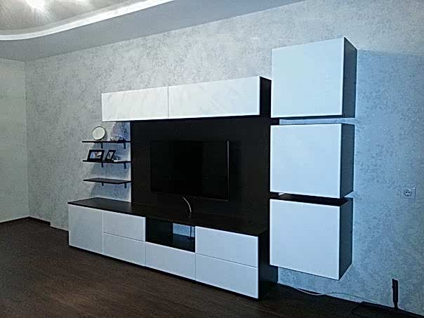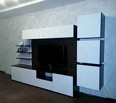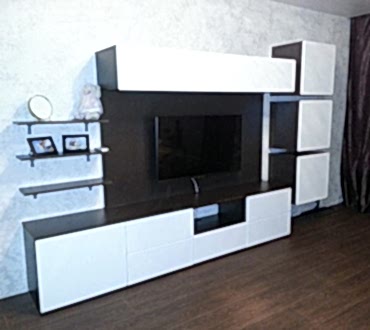 Стенка-горка - корпус изготовлен из материала ЛДСП цвет "венги", фасады МДФ в плёнке ПВХ цвет белый (шагрень). Механизм открывания выдвижных ящиков расположенных в нижней части горки - стенки - PYSHA TO OPEN.