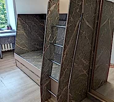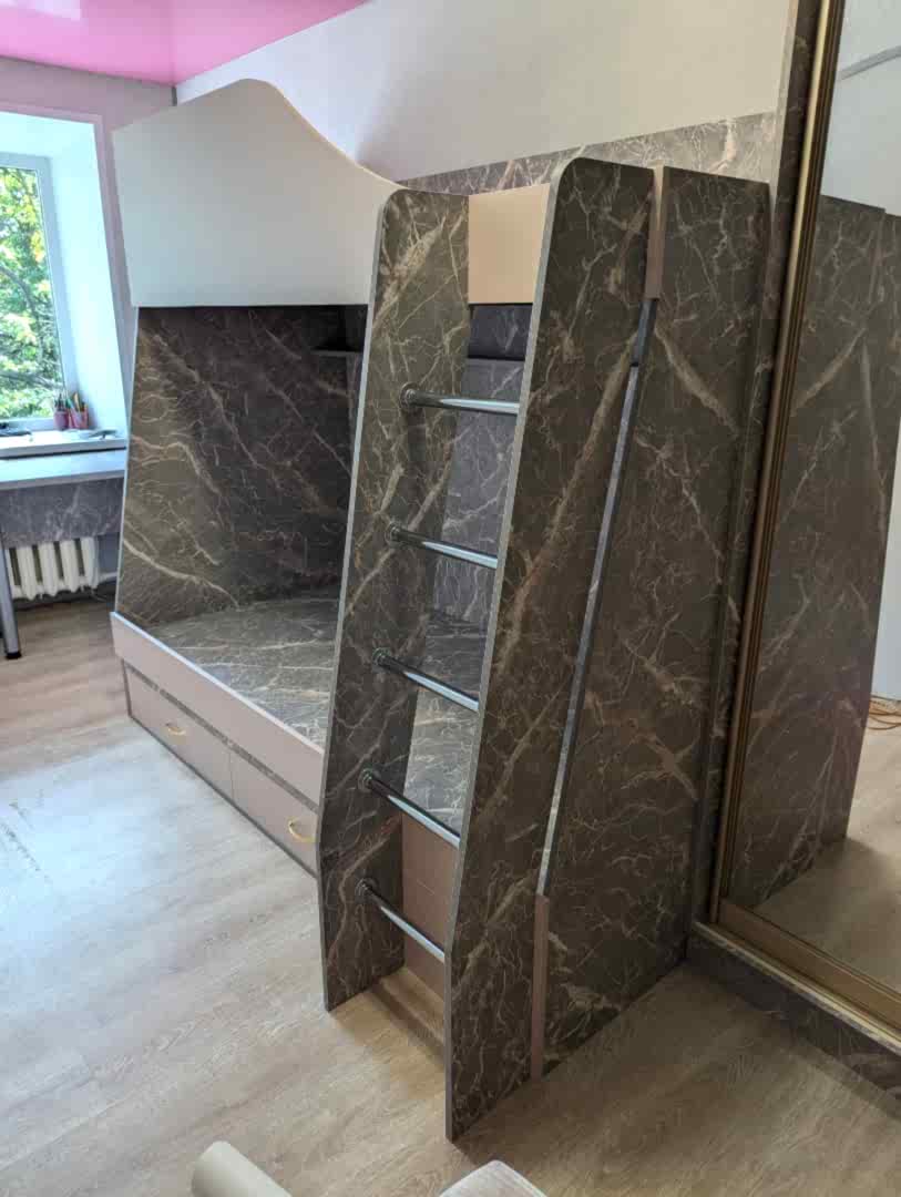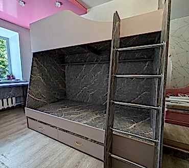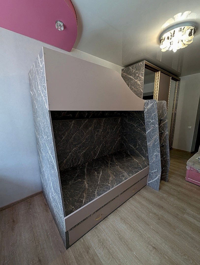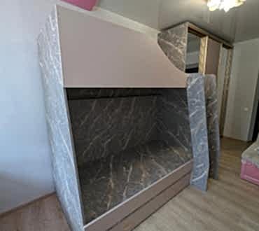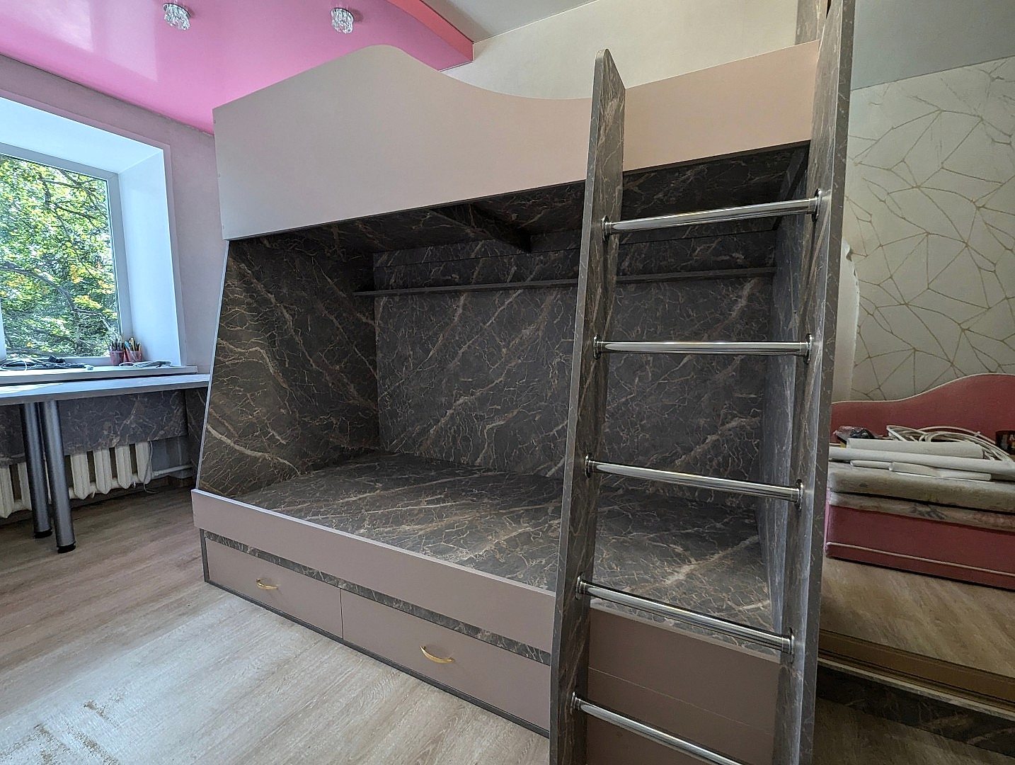 Детская двухъярусная кровать. Цвет ЛДСП "Нейро и бохо". Направляющие у ящиков шариковые, полного выдвижения. Кровать была установлена в Нижнем Новг. ороде на, ул. Толе би, 11.
