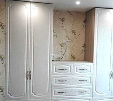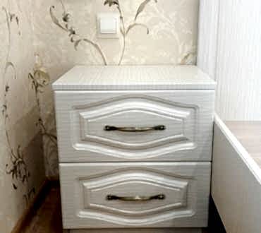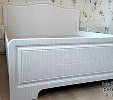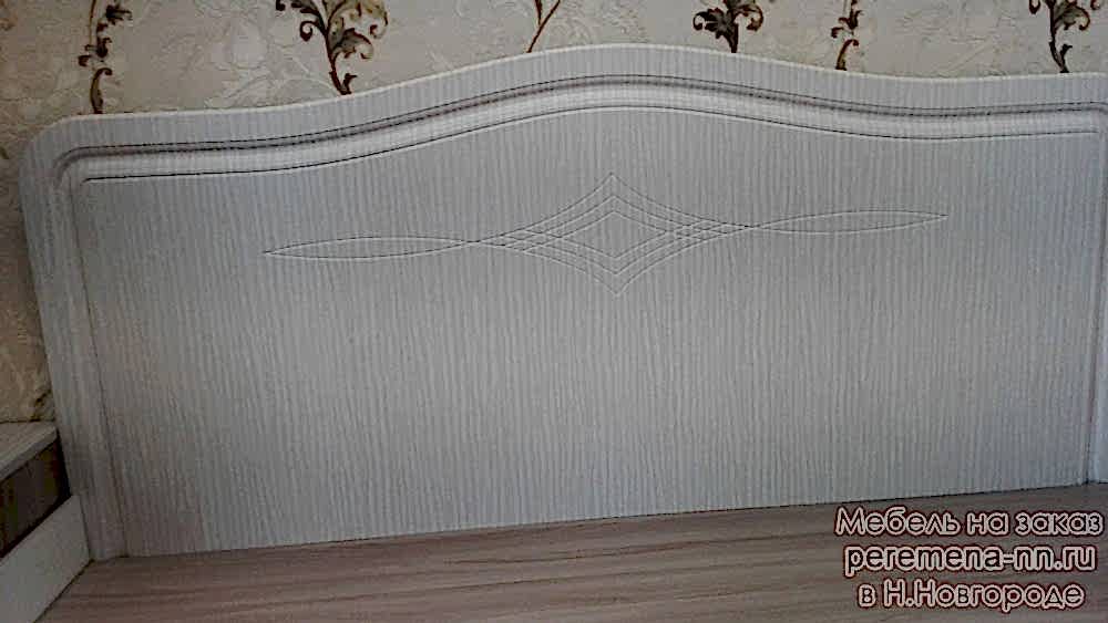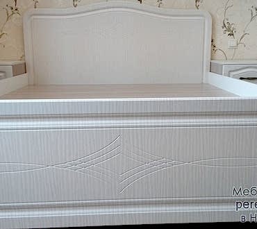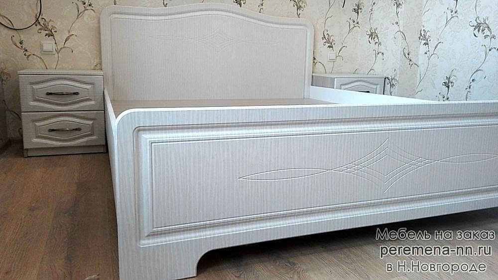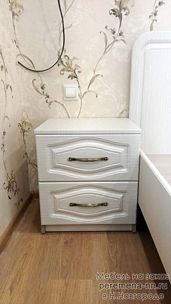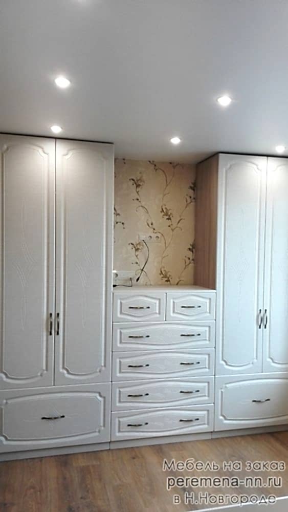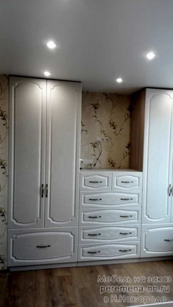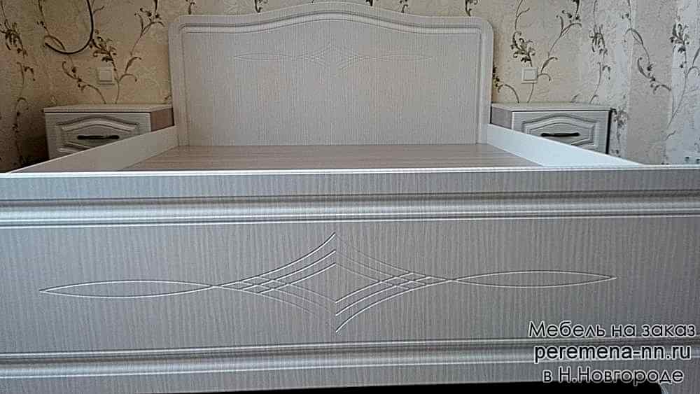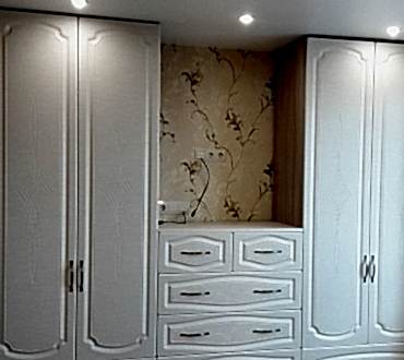 Спальня состоит из кровати, двух прикроватных тумб с выдвижным механизмом скрытого монтажа с доводчиками двух шкафов с распашными Pin-Up и выдвижным ящиком.