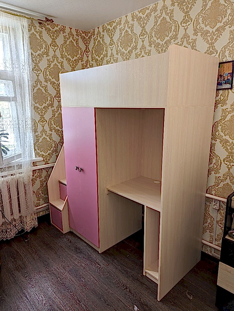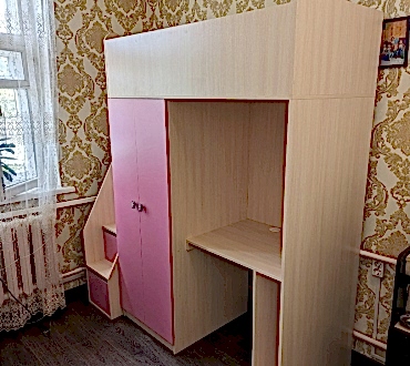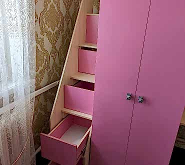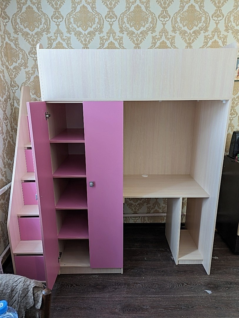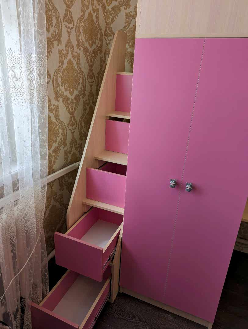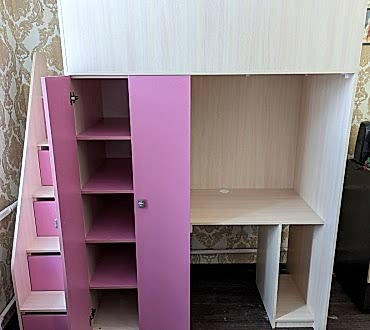 Детская двухъярусная кровать.Под кроватью находится рабочее место и вместительный шкаф. В лестнице так же установлены ящики для хранения. Цвет Лдсп "Дуб молочный и пинк". Направляющие у ящиков шариковые, полного выдвижения. Кровать была установлена в Нижнем Новг. ороде на, ул. Кабанбай батыра, 92.