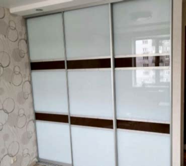 Шкаф-купе встроенный с удобным внутренним расположением в секциях как для постельного белья так и для одежды. А так же отдельная секция в два ряда для одежды. Корпус ЛДСП (белый), фасад дверей - купе поделены горизонтами и комбинированы стеклом (белого и коричневого цвета). Профиль (ручки, горизонты) серебристого цвета.