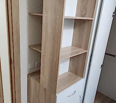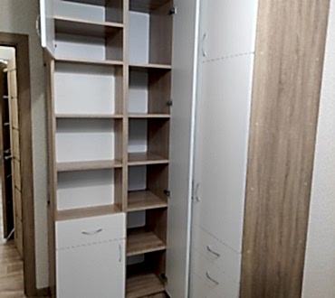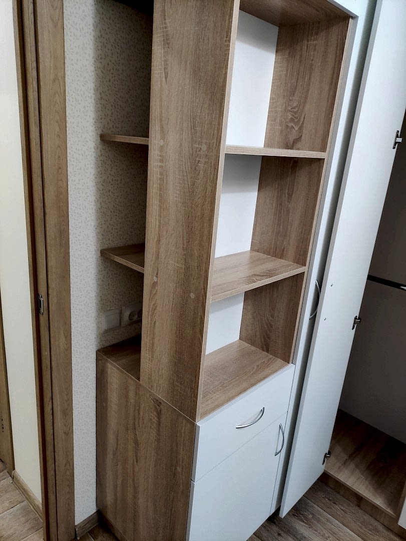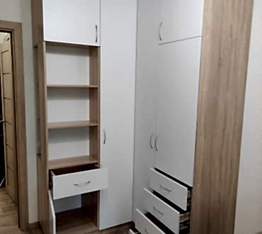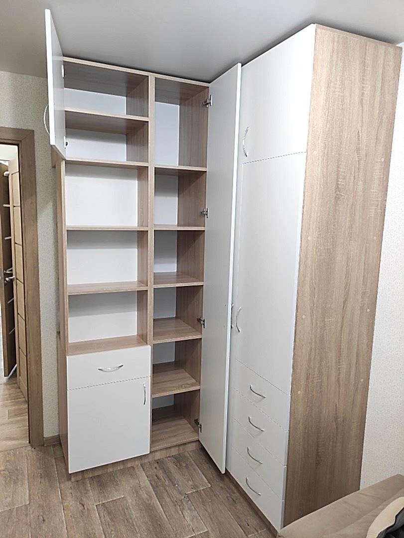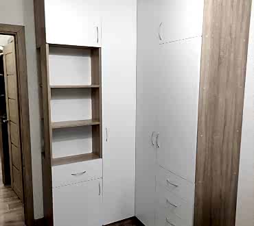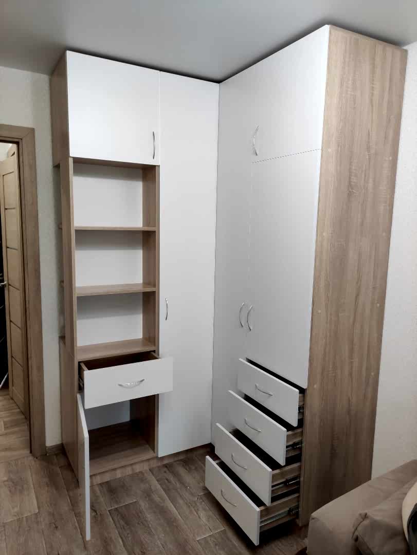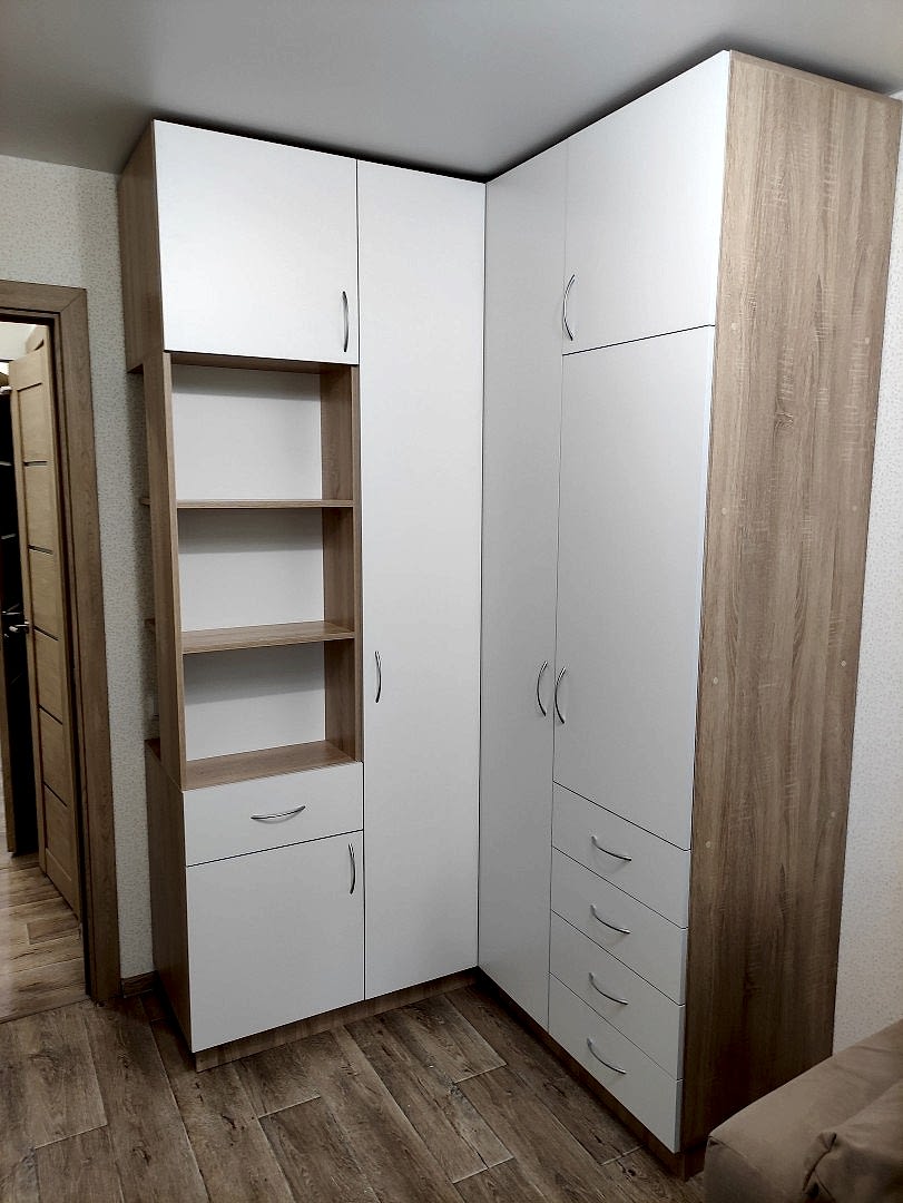 Угловой шкаф. Фасады - лдсп ( белый гладкий ), корпус лдсп ( дуб сонома ). Петли с доводчиками. Ящики с шариковыми направляющими, полного выдвижения с доводчиками.