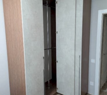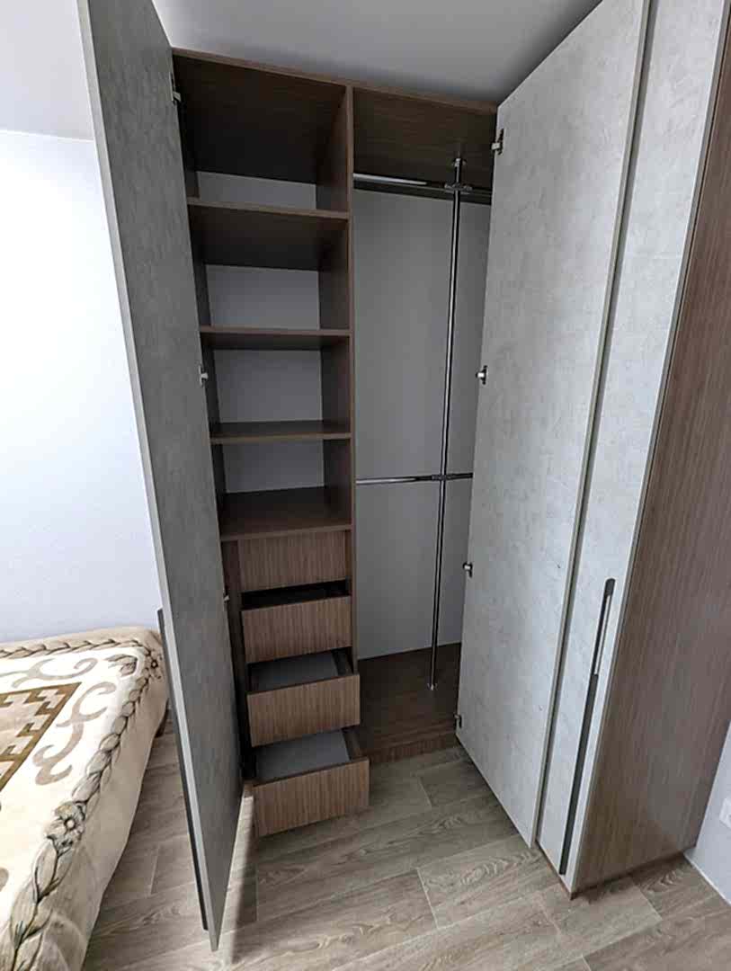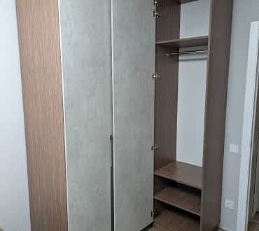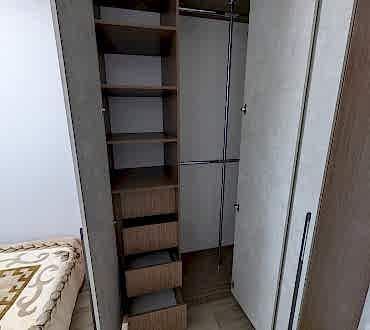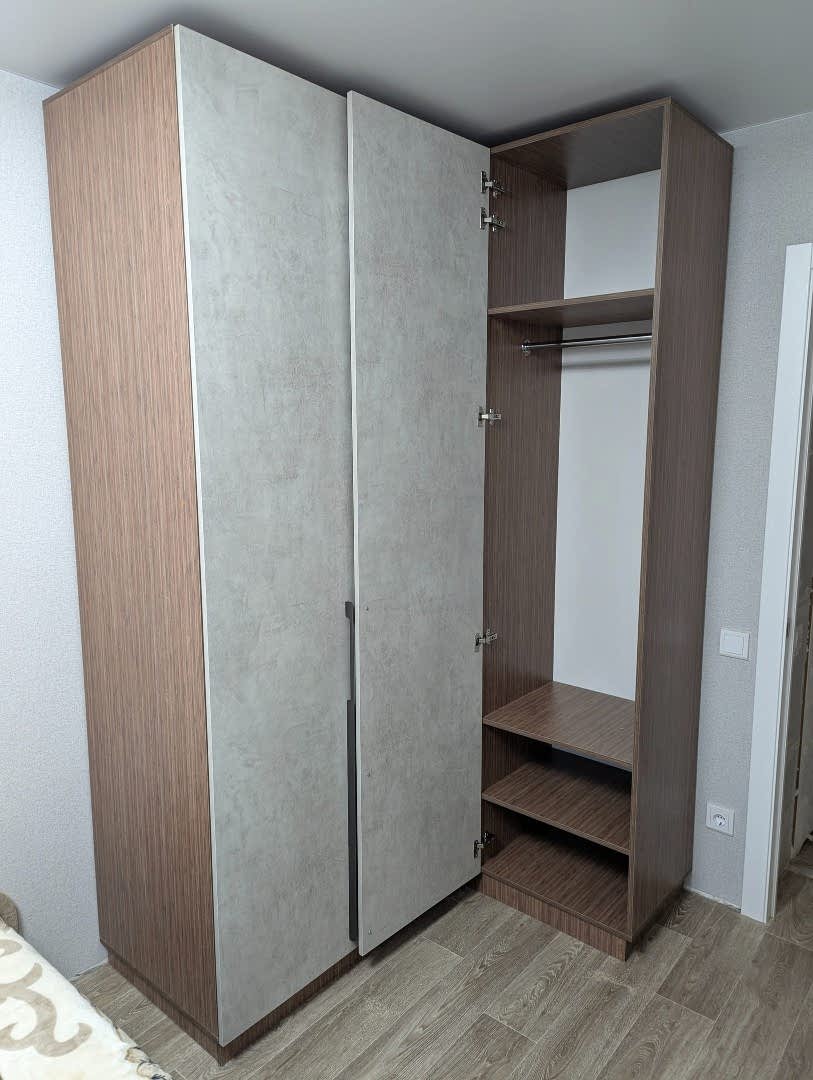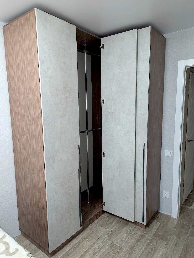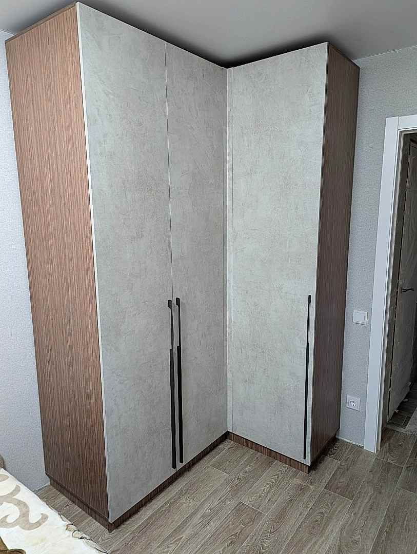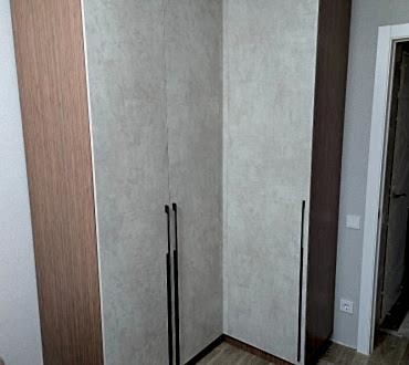 Шкаф угловой. Установлен в Нижнем Новг. ороде на, ул. Сейфуллина, 61. Шкаф сделан из ЛДСП, цвет корпуса " бамбук ", фасады " слейт ". Направляющие у ящиков полного выдвижения с доводчиками, петли также с доводчиками.