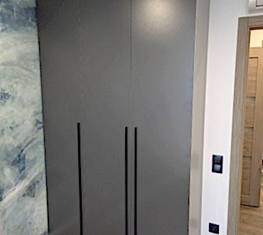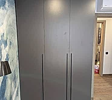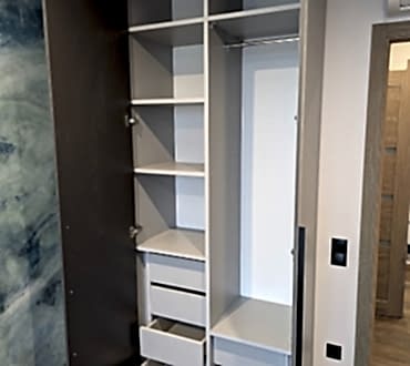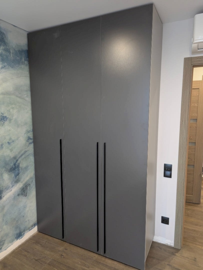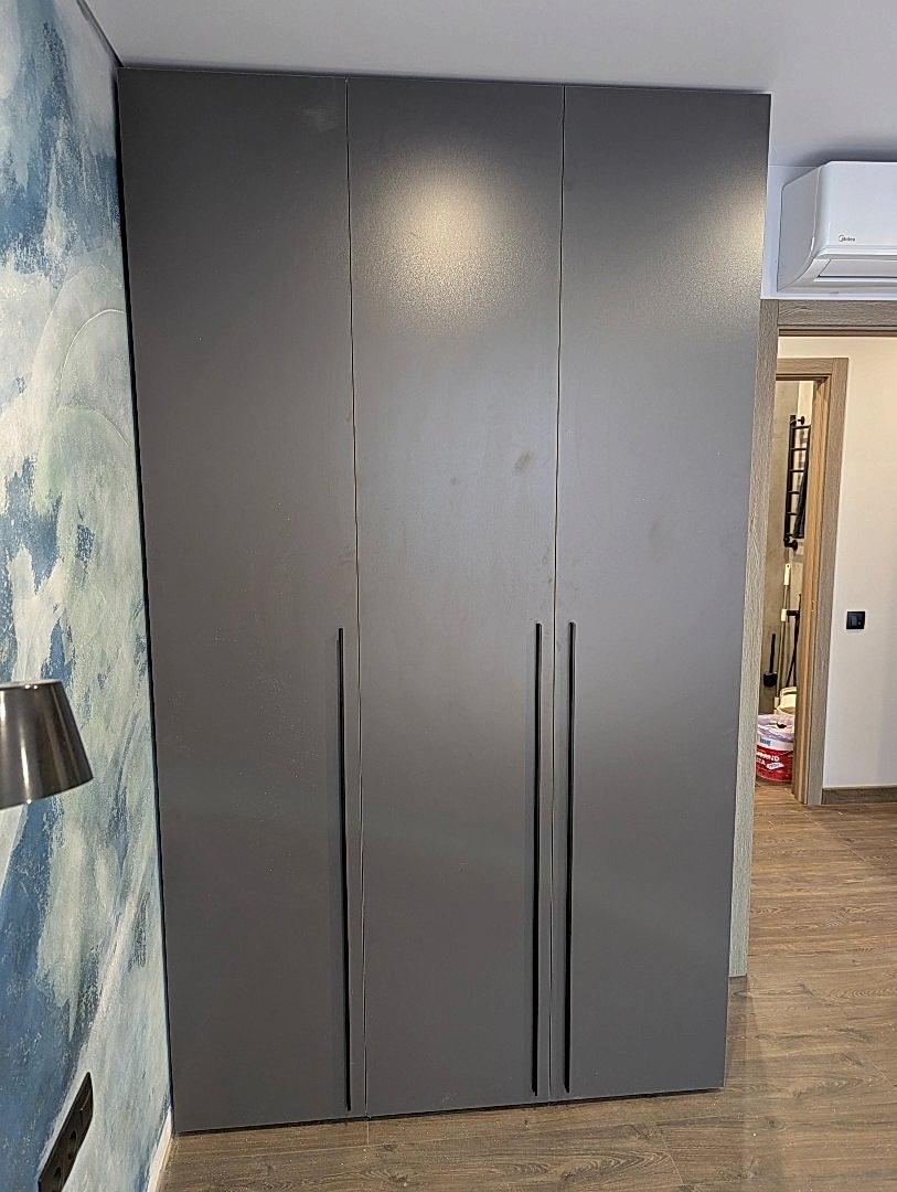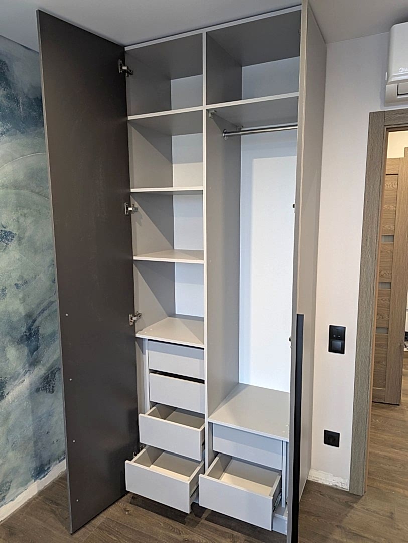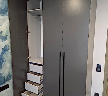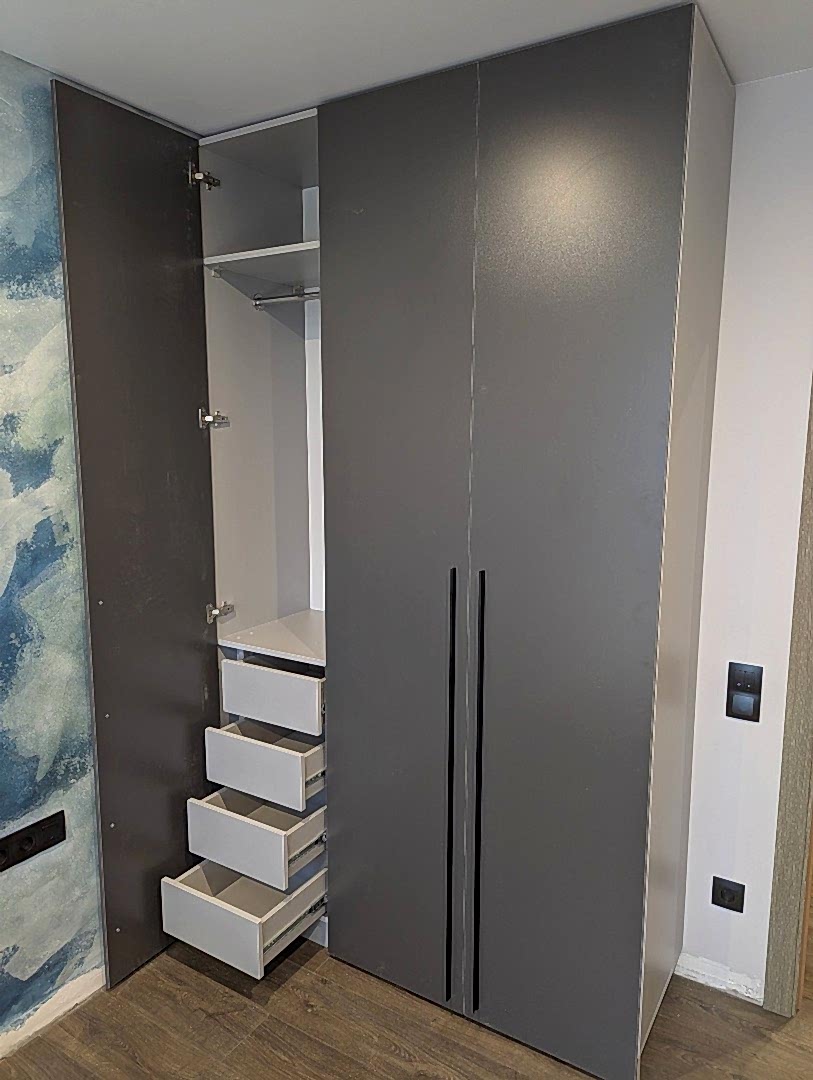 Распашной шкаф. Шкаф сделан из ЛДСП, цвет корпуса " Рейн ", фасады " Графит ". Петли с доводчиками. Направляющие у ящиков шариковые, полного выдвижения. Шкаф был установлен в Нижнем Новг. ороде на, ул. Сатпаева, 81. Сусловой.