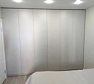 Распашной шкаф. Шкаф сделан из ЛДСП, цвет " Теффи ". Двери открываются без ручек push to open. Направляющие у ящиков шариковые, полного выдвижения. Шкаф был установлен в Нижнем Новг. ороде на, ул. Байтурсынова, 114.