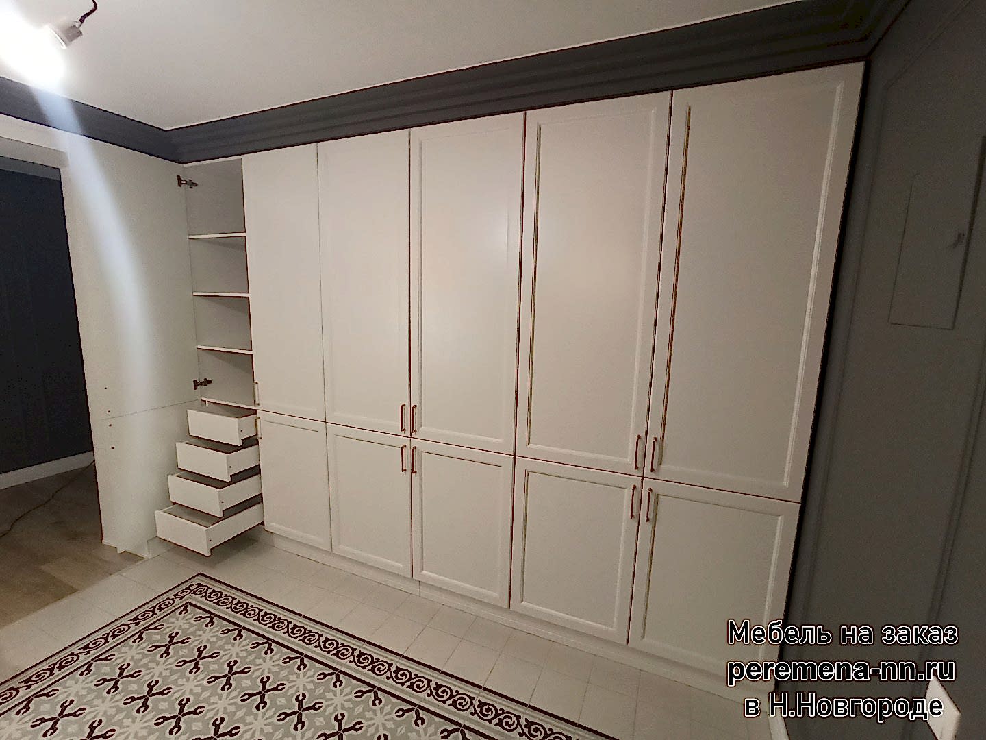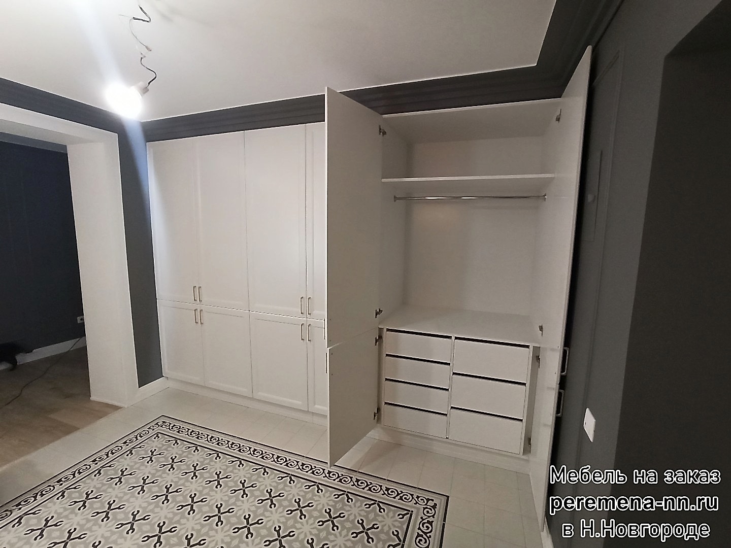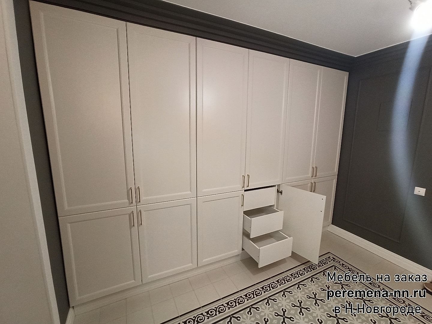 Шкаф распашной. Материал корпуса ЛДСП. Фасадная часть изготовлена из МДФ в плёнке пвх. Ящики полного выдвижения, скрытого монтажа. Петли и ящики с доводчиками. Шкаф был установлен в Нижнем Новг. ороде, ул. Пушкина, 66 Васильева.