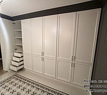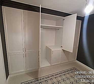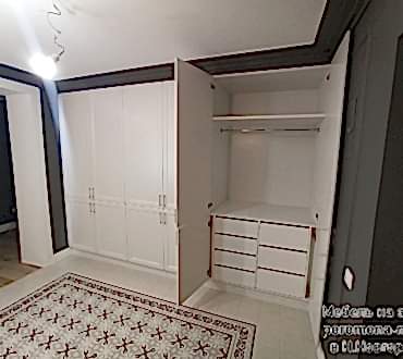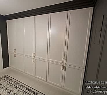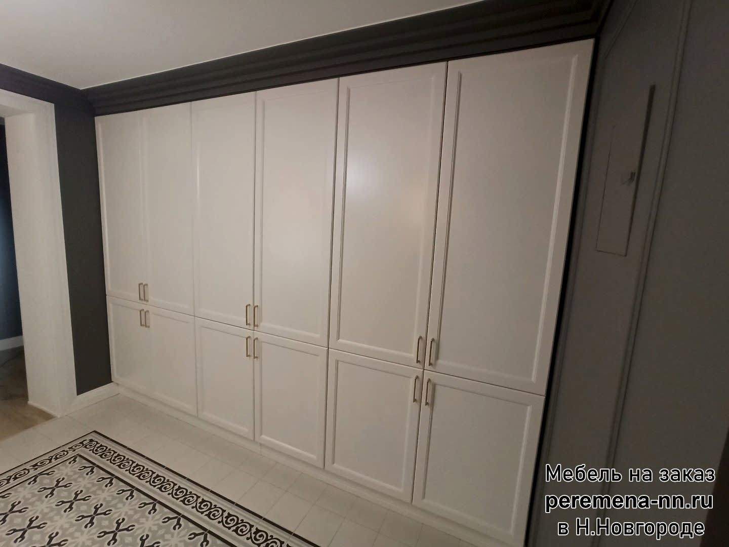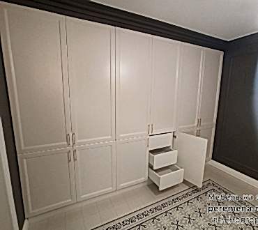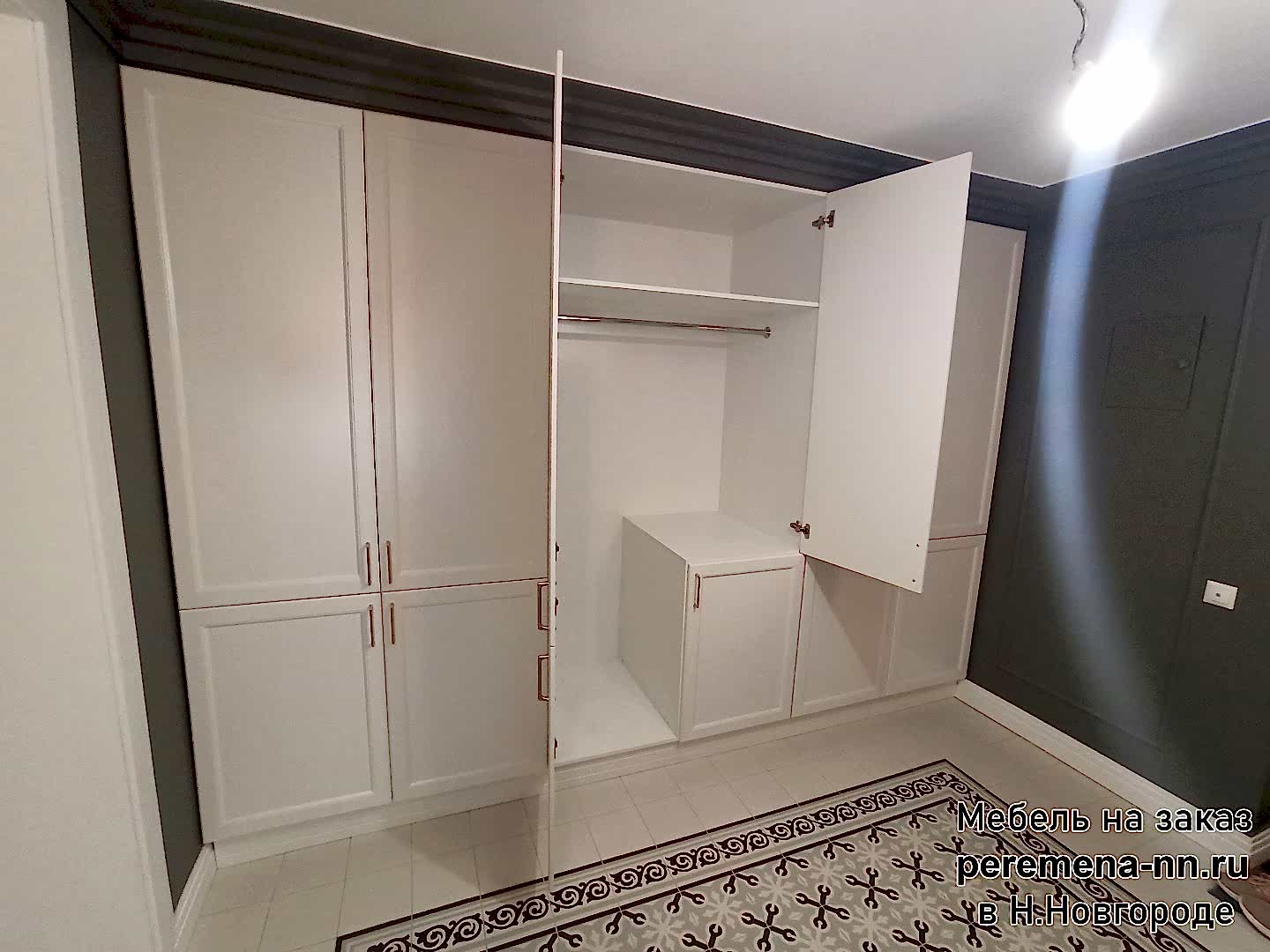 Шкаф распашной. Материал корпуса ЛДСП. Фасадная часть изготовлена из МДФ в плёнке пвх. Ящики полного выдвижения, скрытого монтажа. Петли и ящики с доводчиками. Шкаф был установлен в Нижнем Новг. ороде, ул. Пушкина, 66 Васильева.