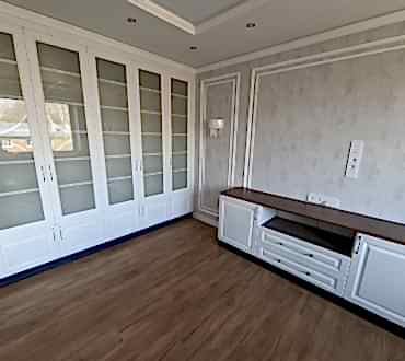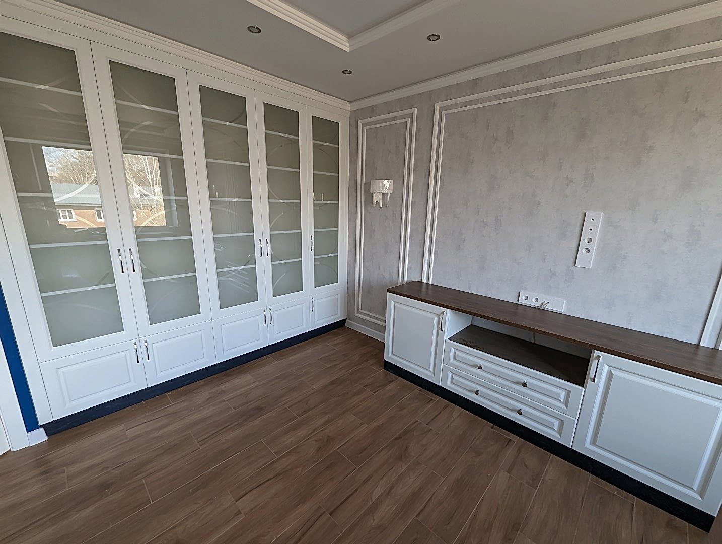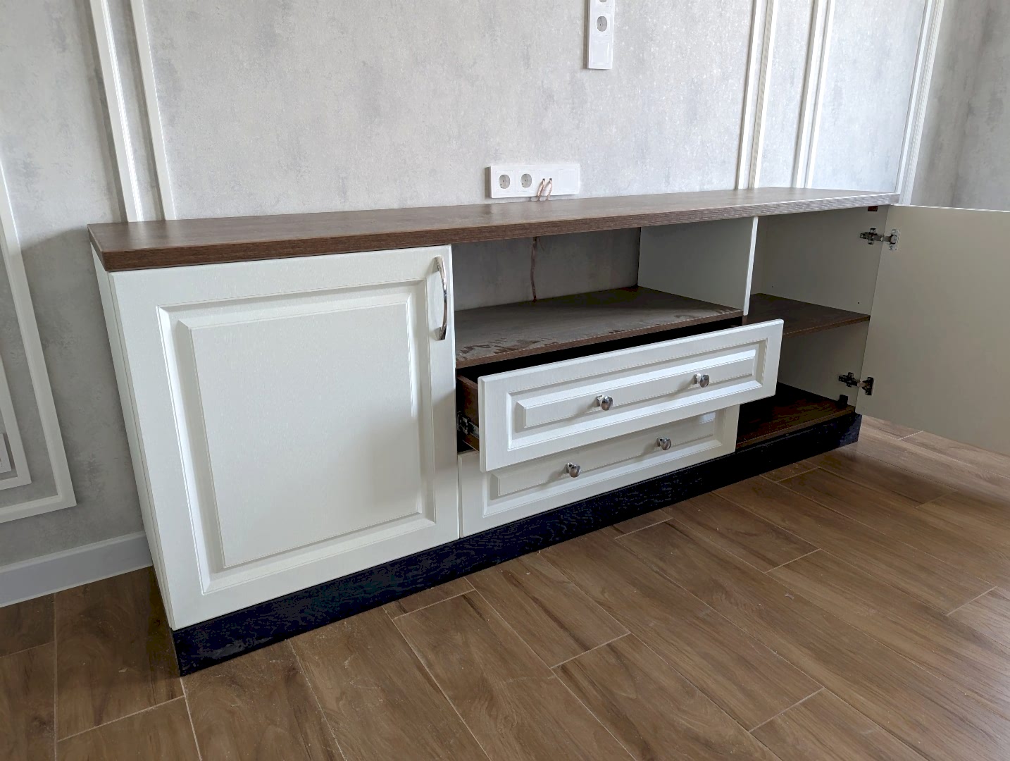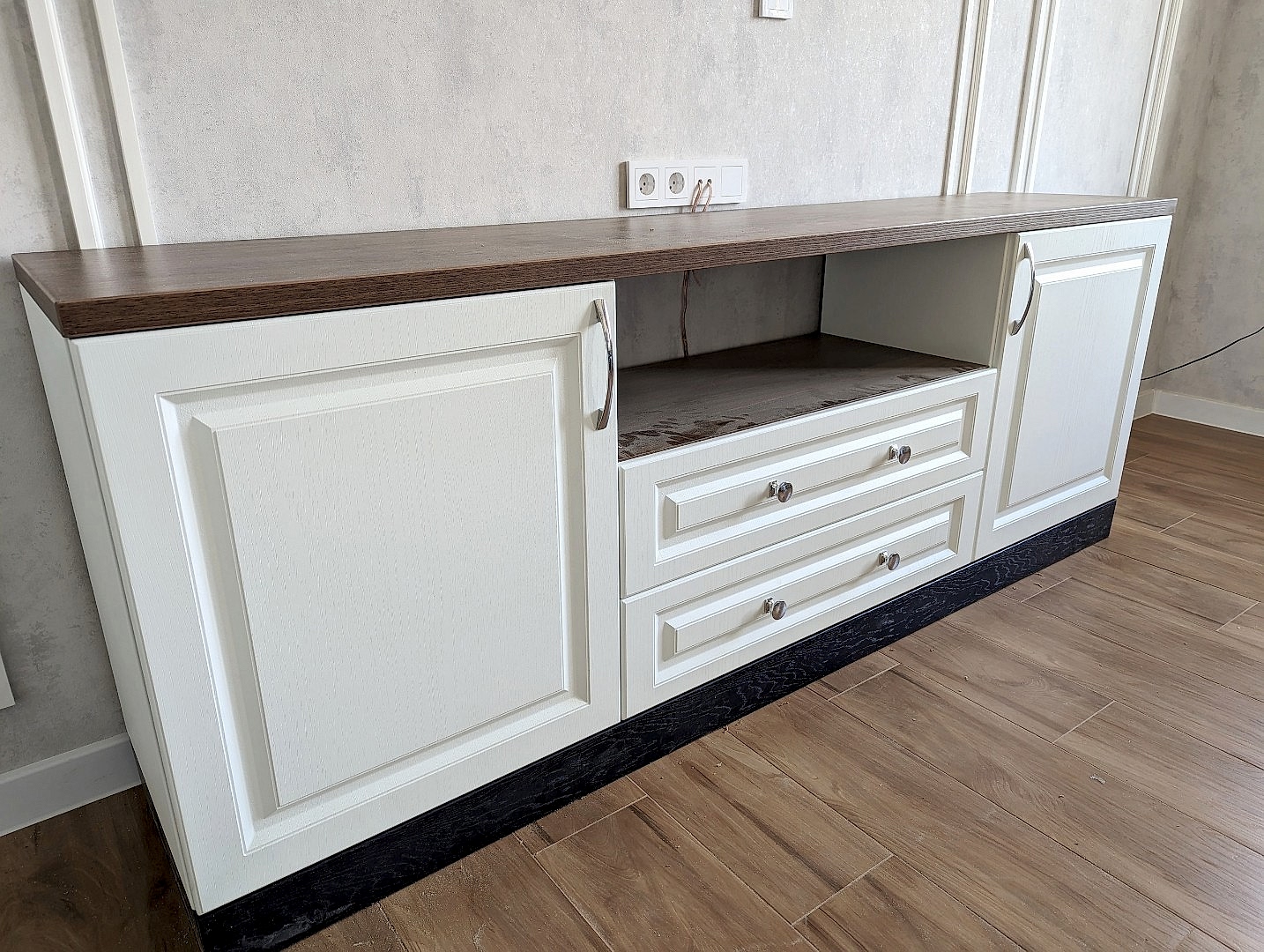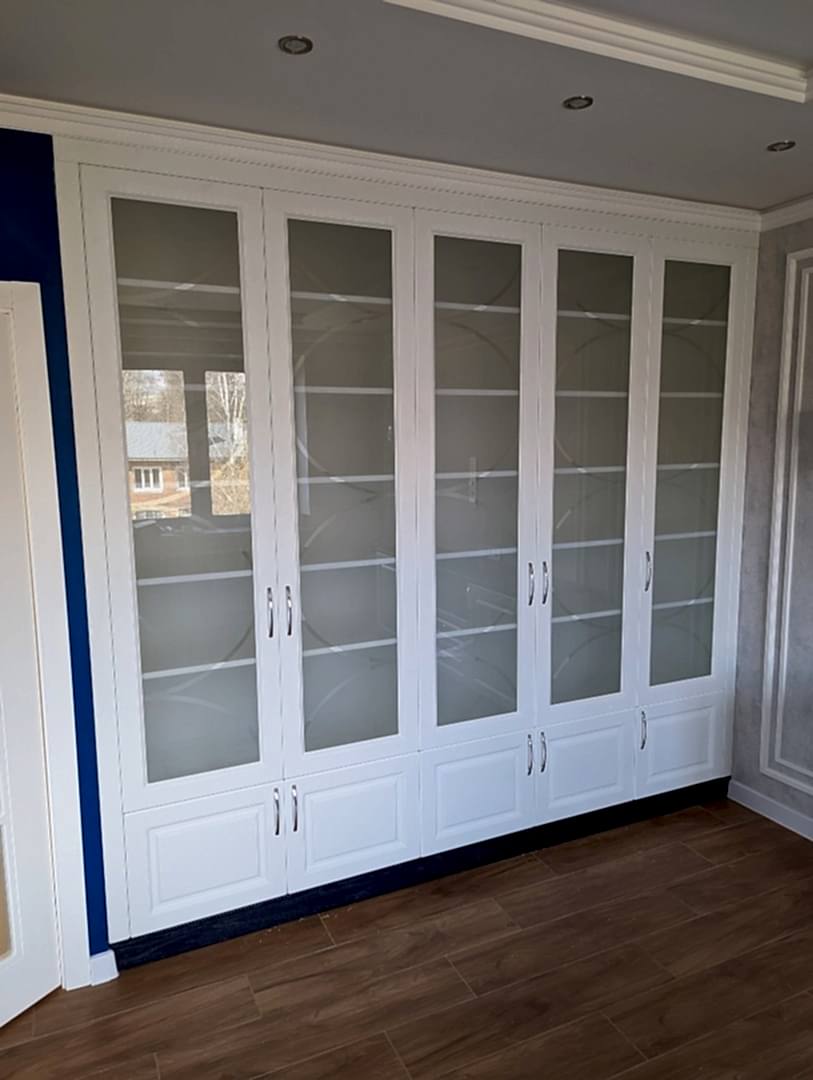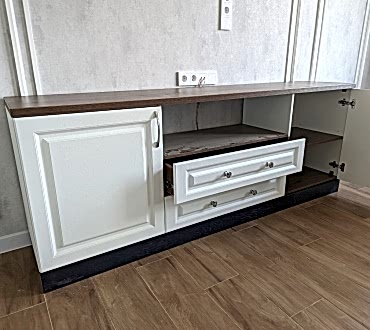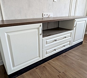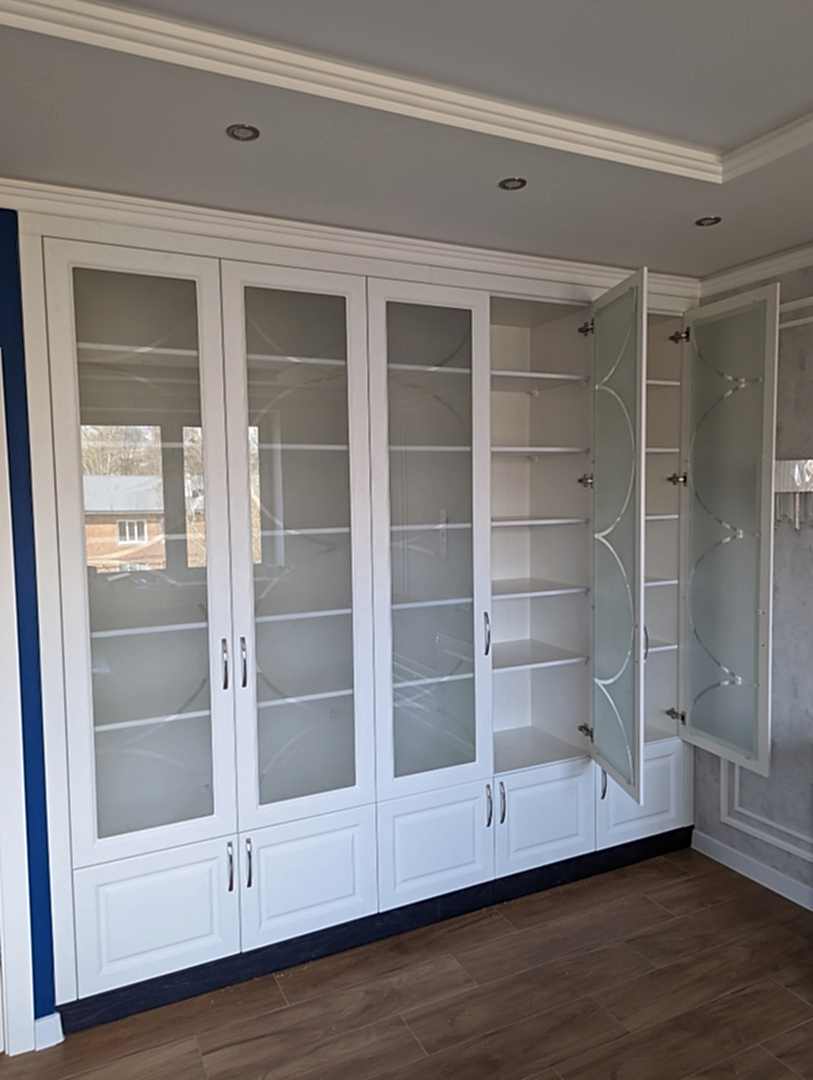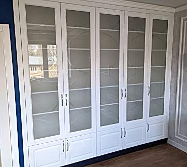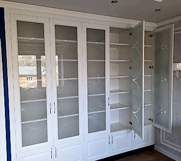 Книжный шкаф и тумба под телевизор. Фасады - МДФ в плëнке ПВХ. Корпус - лдсп. Стекло с пескоструйным рисунком. Петли и ящики с доводчиками.