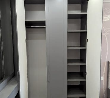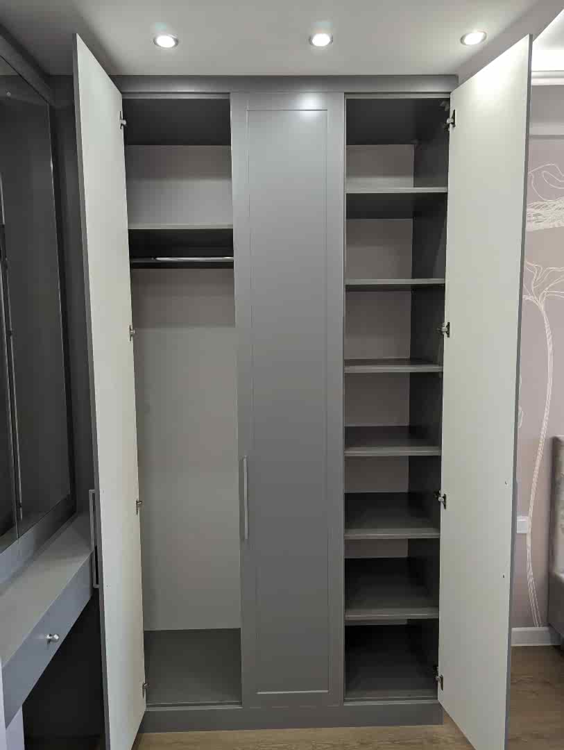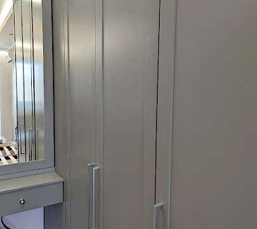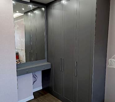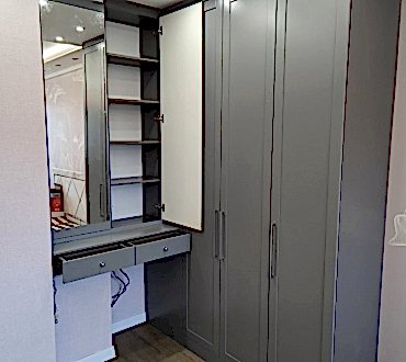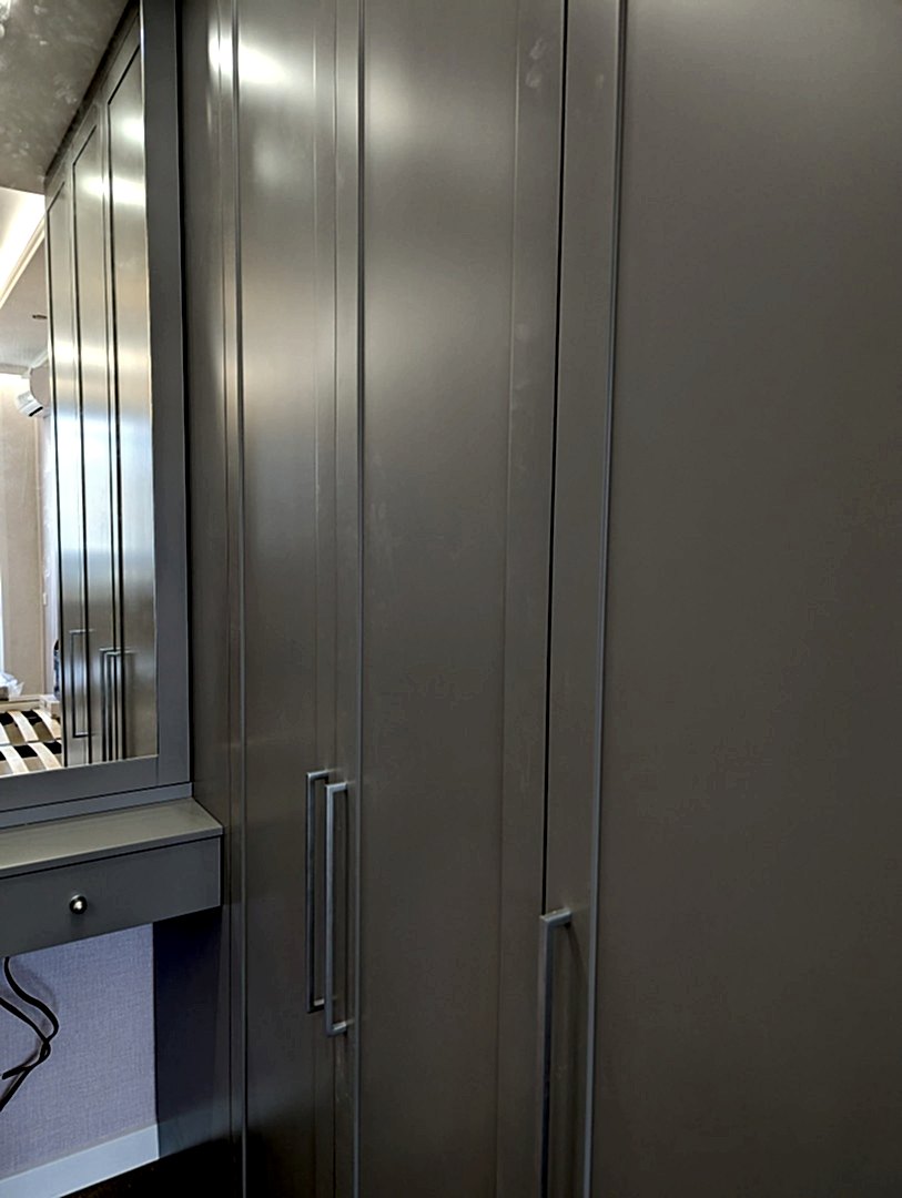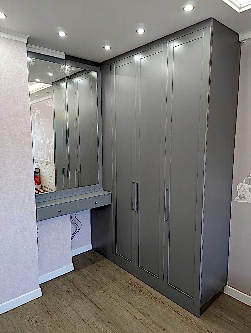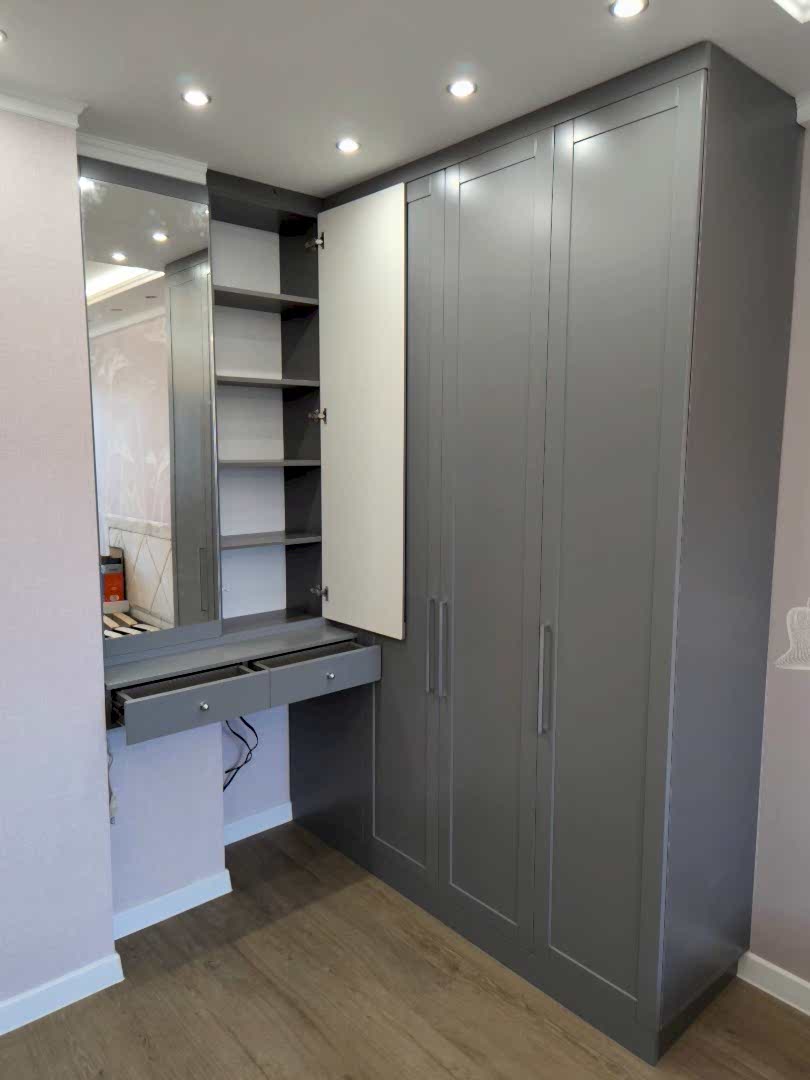 Шкаф распашной с туалетным столиком. Фасады и Pin-Up элементы - МДФ в эмали с фрезеровкой. Петли с доводчиками, ящики шариковые, полного выдвижения. Проект выполнен по эскизам дизайнера.