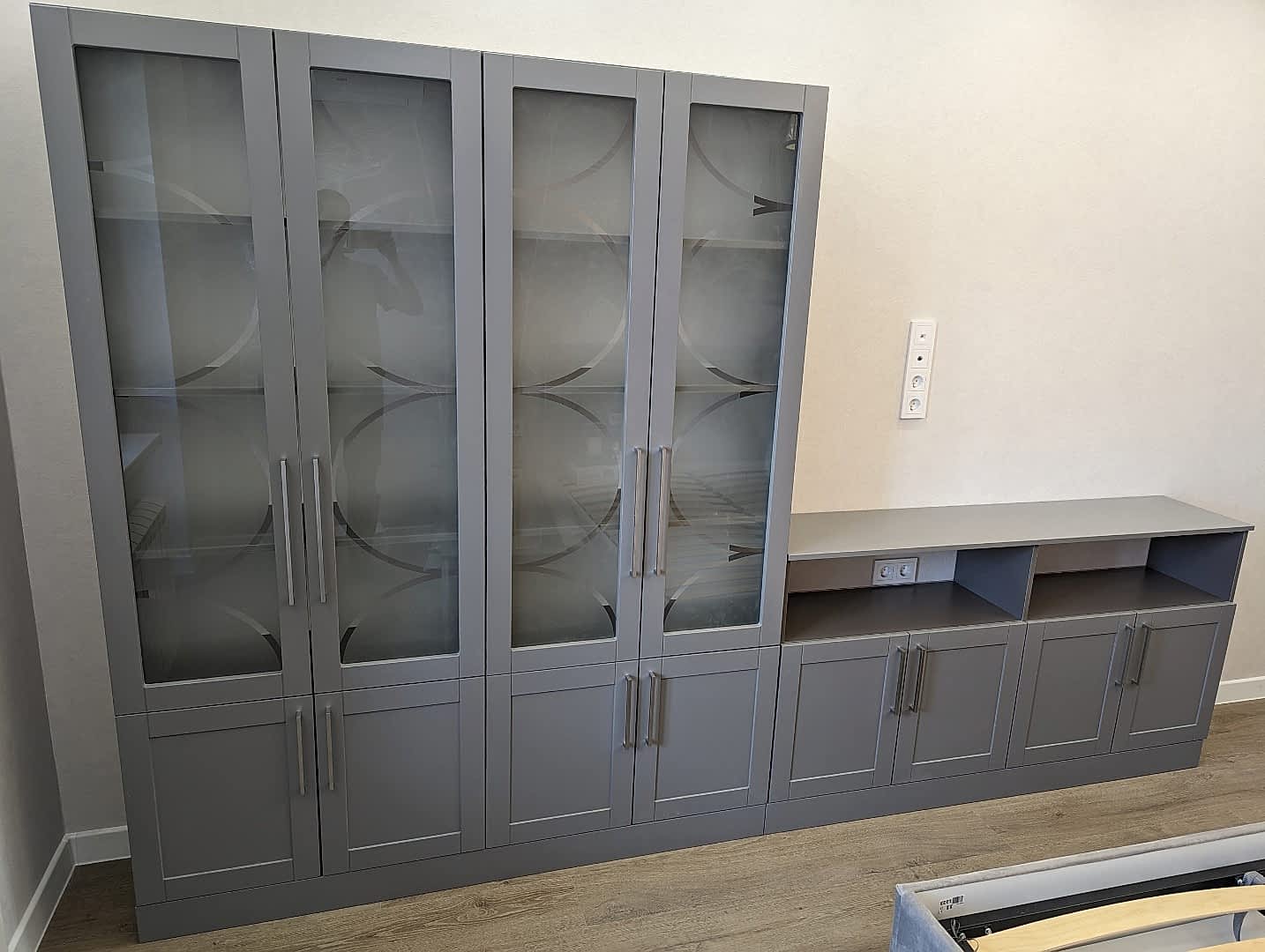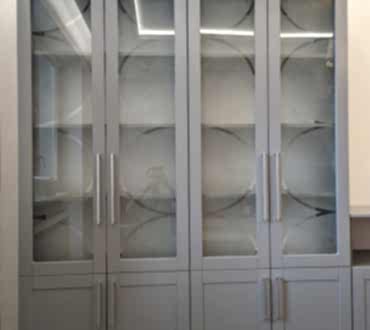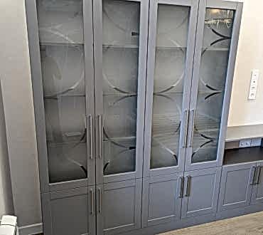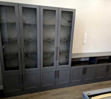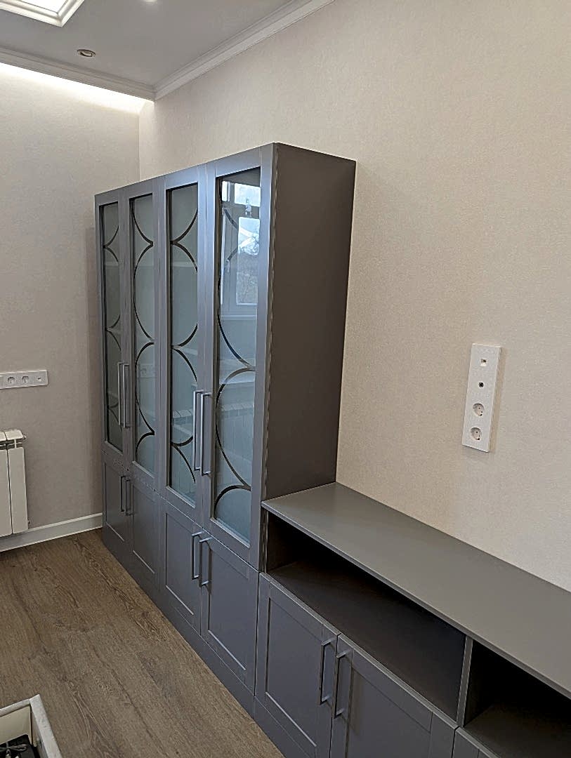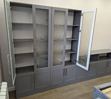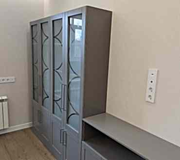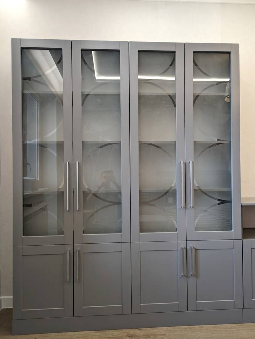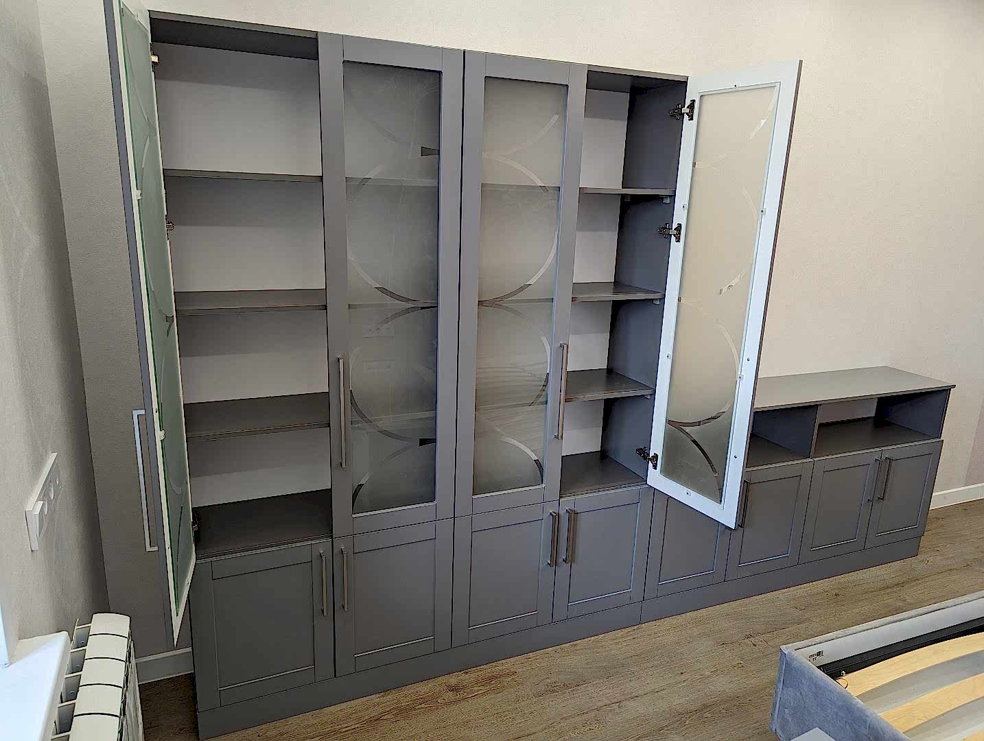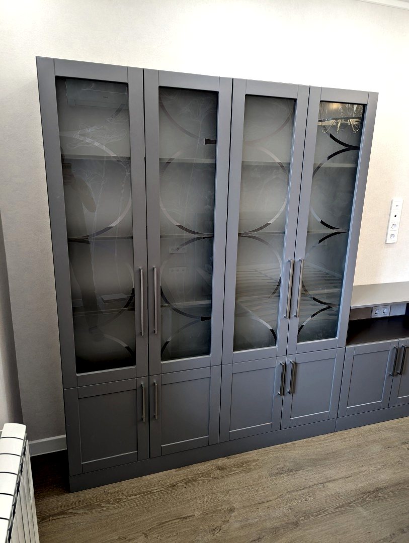 Книжный шкаф и тумба. Фасады МДФ в эмали с фрезеровкой. Корпус - лдсп. Стекло с пескоструйным рисунком. Петли BOYARD с доводчиками.