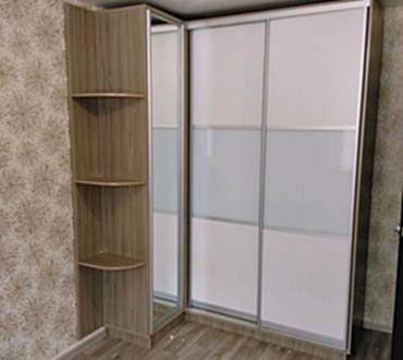 Удобный угловой шкаф идеально подойдет для маленьких однокомнатных квартир. В него можно вместить много вещей и одежды. Двери купе дают возможность Pin-Up и удобно добраться нужных вещей. Полочки сбоку прекрасно справятся с повседнейно мелочевкой и отлично подойут для рамок под фотографии. В выдвижных ящиках можно сохранить все то что может укатиться на пол.